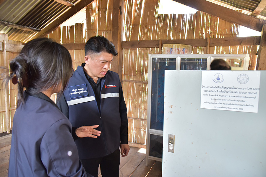 หลังจากนั้น ได้ติดตามความคืบหน้าโครงการติดตั้งระบบผลิตไฟฟ้าเพื่อชุมชนพึ่งพาตนเอง (Off Grid) ระบบผลิตไฟฟ้าเพื่อบ้านพักอาศัย (Solar Home) บ้านตะเพินคี่ ต.วังยาว อ.ด่านช้าง จ.สุพรรณบุรี ซึ่งอยู่ใต้การควบคุมดูแลของสำนักงานพลังงานจังหวัดสุพรรณบุรี โดยใช้งบประมาณจากกองทุนเพื่อส่งเสริมการอนุรักษ์พลังงานจำนวน 2,842,000 บาท บูรณาการร่วมกับ อบต.วังยาว และอุทยานแห่งชาติพุเตย ติดตั้งระบบผลิตไฟฟ้าพลังงานแสงอาทิตย์ขนาด 500 วัตต์ พร้อมอุปกรณ์ครบชุด รวมทั้งสิ้น 58 ระบบ สำหรับ 58 ครัวเรือน โดยนายสิทธิชัย ณ นคร พลังงานจังหวัดสุพรรณบุรี กล่าวว่า ผลสำเร็จของโครงการดังกล่าว ช่วยให้ชาวบ้านทั้ง 58 ครัวเรือน ประหยัดค่าไฟรวมกว่า 208,800 บาทต่อปี ลดค่าใช้จ่ายภาครัฐในการขยายสายส่งไฟฟ้ารวม 6,500,000 บาท และเพิ่มการใช้พลังงานทดแทนในหมู่บ้านเฉลี่ย 4.5 ตันเทียบเท่าน้ำมันดิบต่อปี ช่วยยกระดับคุณภาพชีวิต และสามารถต่อยอดจากการมีไฟฟ้าใช้ไปสู่การสร้างอาชีพ และมีรายได้เสริม โดยเฉพาะกิจกรรมการท่องเที่ยวในชุมชน อาทิ การจัดพื้นที่ลานกางเต็นท์ ร้านกาแฟชุมชน และกิจกรรมท่องเที่ยวเชิงอนุรักษ์