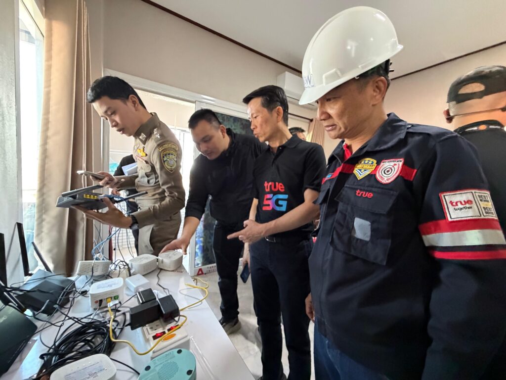 พ.ต.ท.ตฤณ ลีลานุช สารวัตรกลุ่มงานสนับสนุน คดีเทคโนโลยี บก.ปอท. สอบสวนกลาง กล่าวว่า “จากความร่วมมือกับทรู และผู้ให้บริการรายอื่นในการปราบปรามมิจฉาชีพออนไลน์ พบว่ามีห้องหนึ่งที่เช่าอะพาร์ตเมนต์ อ.แม่สาย จ.เชียงราย ติดกับชายแดน มีการใช้งานอินเทอร์เน็ตที่สูงผิดปกติ จึงได้ดำเนินการสอบสวน และเฝ้าติดตาม จนมั่นใจได้ว่ามีการใช้งานในทางผิดกฎหมาย และพบจุดน่าสงสัยอื่นๆ เช่นผู้เช่าห้องเคยมีความผิดทางคดีต่างๆ และสืบต่อในทางลับ จึงได้ขอหมายศาลในการตรวจค้นห้องดังกล่าว พบว่ามีการลักลอบใช้อุปกรณ์ผิดกฎหมายส่งสัญญาณอินเทอร์เน็ตข้ามแดนไปทางเมียนมา และร่วมมือกับทรูและผู้ให้บริการรายอื่นตัดวงจรให้บริการทันที และยึดอุปกรณ์ที่ผิดกฎหมาย พร้อมทั้งติดตามคนร้ายให้ได้โดยไวเพื่อนำตัวมาดำเนินคดีต่อไป“