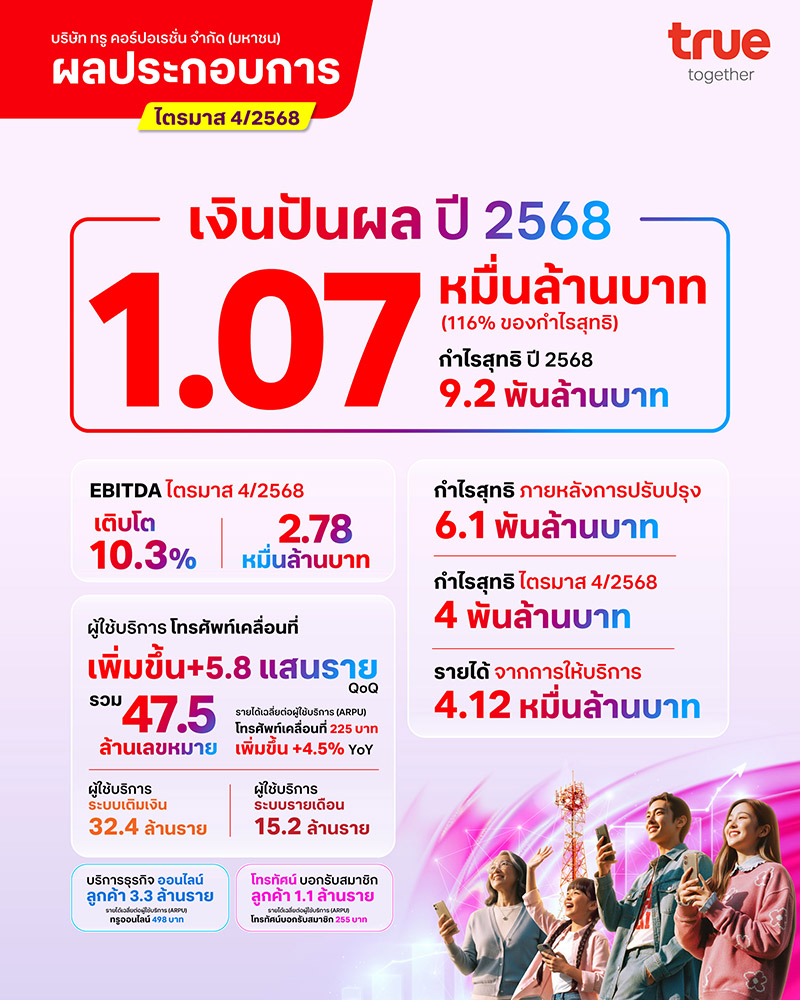 19 กุมภาพันธ์ 2569 – บริษัท ทรู คอร์ปอเรชั่น จำกัด (มหาชน) ประกาศผลการดำเนินงานประจำไตรมาส 4/2568 โดยสามารถทำกำไรสุทธิได้ต่อเนื่องเป็นไตรมาสที่ 4 ติดต่อกัน บริษัทฯ รายงานผลกำไรสุทธิหลังหักภาษีจำนวน 4 พันล้านบาท และกำไรสุทธิหลังปรับปรุงรายการพิเศษ (Normalized Profit) จำนวน 6.1 พันล้านบาท สำหรับ EBITDA ในไตรมาสนี้อยู่ที่ 2.78 หมื่นล้านบาท สะท้อนผลประโยชน์เต็มไตรมาสจากการได้ใบอนุญาตคลื่นความถี่ ทั้งนี้ คณะกรรมการบริษัทฯ มีมติเสนอจ่ายเงินปันผลประจำปีจำนวน 4.1 พันล้านบาท ส่งผลให้เงินปันผลรวมทั้งปีอยู่ที่ 1.07 หมื่นล้านบาท คิดเป็นอัตราการจ่ายเงินปันผล 116% ของ NPAT ตามรายงาน และ 56% ของ NPAT หลังปรับปรุงรายการพิเศษ