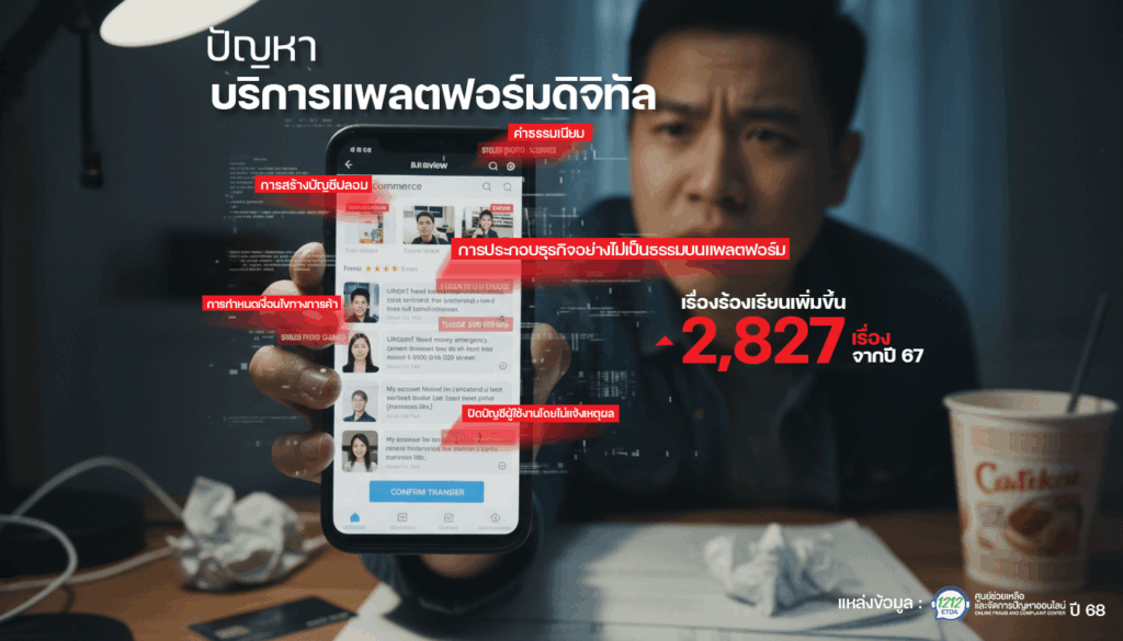 เมื่อวิเคราะห์เชิงลึกระหว่างปี 2567-2568 จากการให้บริการรับเรื่องปัญหา การให้บริการแพลตฟอร์มดิจิทัล พบว่า มีเรื่องร้องเรียนเพิ่มขึ้นทั้งหมด 2,827 เรื่อง โดยปัญหาจากบริการแพลตฟอร์มดิจิทัลที่พบมากสุด ได้แก่ 1.การประกอบธุรกิจอย่างไม่เป็นธรรมบนแพลตฟอร์ม เช่น การกำหนดเงื่อนไขทางการค้า ค่าธรรมเนียม นโยบาย ที่เอื้อประโยชน์ต่อผู้ประกอบธุรกิจมากกว่าผู้ใช้บริการ หรือปิดบัญชีผู้ใช้งานโดยไม่แจ้งเหตุผล การไม่ได้รับการเยียวยาความเสียหาย 2.ปัญหาการคุ้มครองข้อมูลส่วนบุคคล เช่น การนำข้อมูลไปใช้โดยไม่ได้รับความยินยอม การสร้างบัญชีปลอม และการเผยแพร่ข้อมูลส่วนบุคคล และ 3.ปัญหาการเรียกรถผ่านแอปพลิเคชัน ที่มีอัตราการเพิ่มขึ้นเมื่อเทียบกับปี 2567 ทั้งกรณีเรียกเก็บค่าบริการไม่เป็นธรรม ราคาที่แสดงไม่ตรงกับยอดที่จ่ายจริง การยกเลิกรถโดยไม่แจ้งล่วงหน้าและการให้บริการที่ไม่เป็นไปตามเงื่อนไข