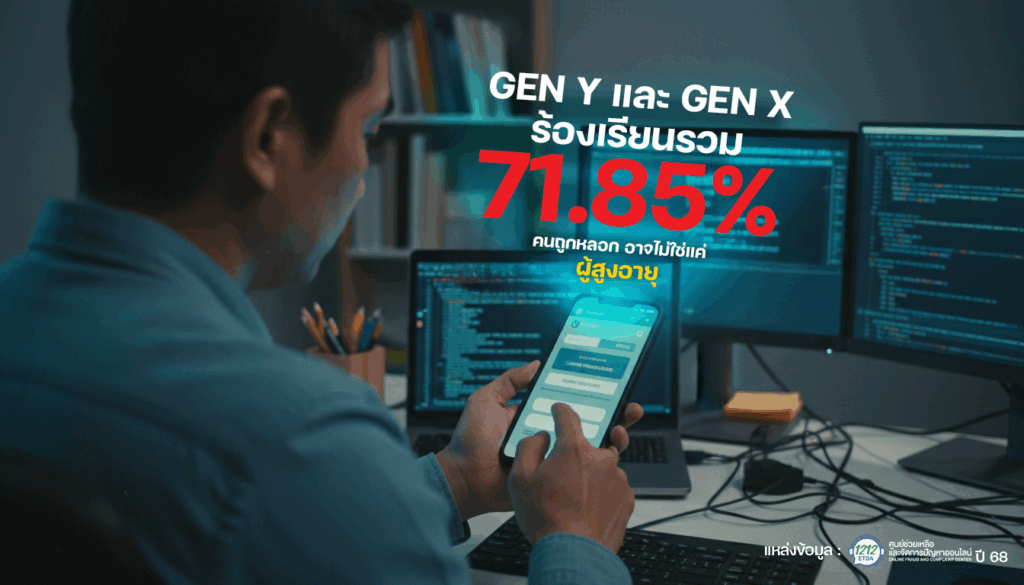 เมื่อจำแนกกลุ่มผู้ร้องเรียนตามช่วงวัยในช่วงปี 2566–2568 พบว่า กลุ่มวัยทำงานเป็นกลุ่มที่ถูกหลอก ตกเป็นเหยื่อมากที่สุด โดยกลุ่ม Gen Y (อายุ 29–44 ปี) มีสัดส่วนถูกหลอกสูงสุด 41.91% รองลงมาคือ Gen X (อายุ 45–60 ปี) 29.94% รวมกันคิดเป็น 71.85% ของจำนวนผู้ร้องเรียนทั้งหมด ขณะที่กลุ่มผู้สูงอายุ (Baby Boomer) มีสัดส่วน 10.64% Gen Z (16–28 ปี) คิดเป็น 17.28% และ Gen Alpha (12–15 ปี) คิดเป็น 0.23%