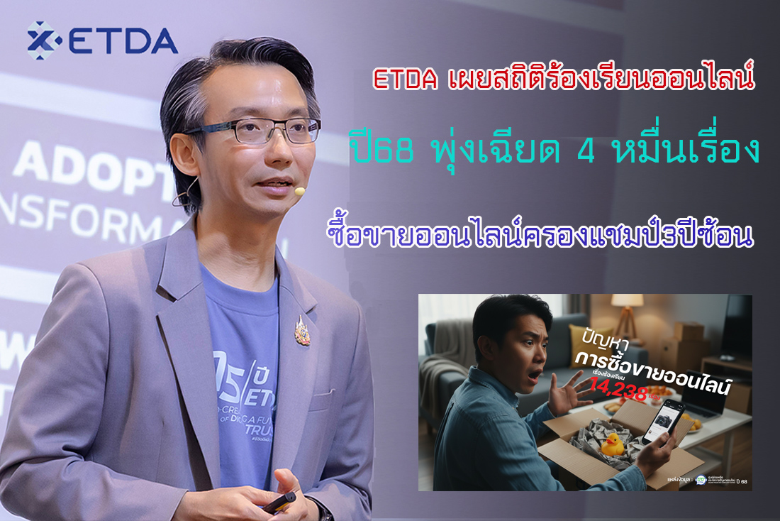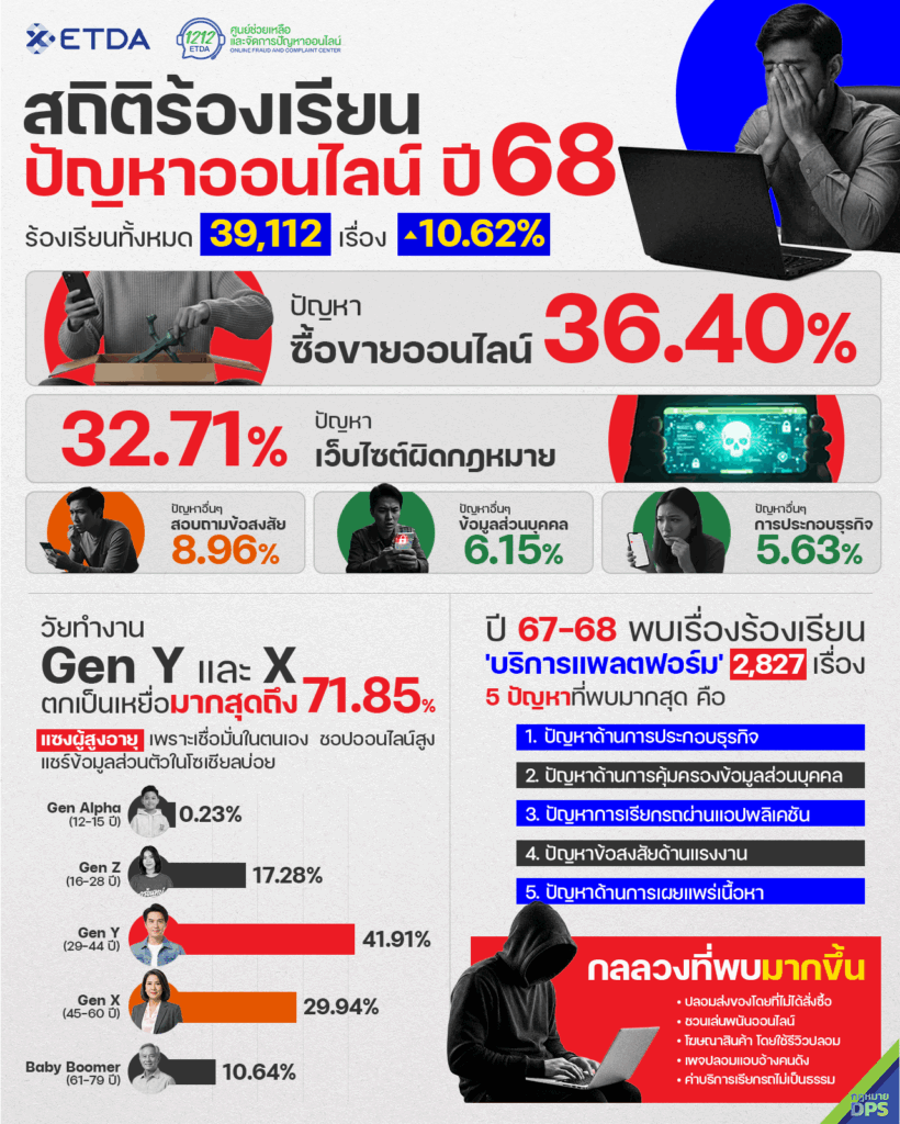 ETDA เปิดสถิติศูนย์ 1212 ETDA ปี 68 เรื่องร้องเรียนปัญหาออนไลน์พุ่ง 39,112 เรื่อง เพิ่มจากปีก่อน 10.62 % ซื้อขายออนไลน์ครองแชมป์ต่อเนื่อง วัยทำงาน Gen Y ตกเป็นเหยื่อสูงสุด