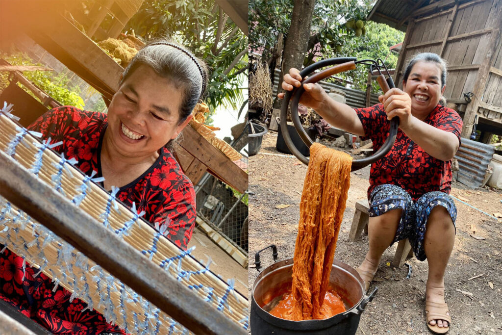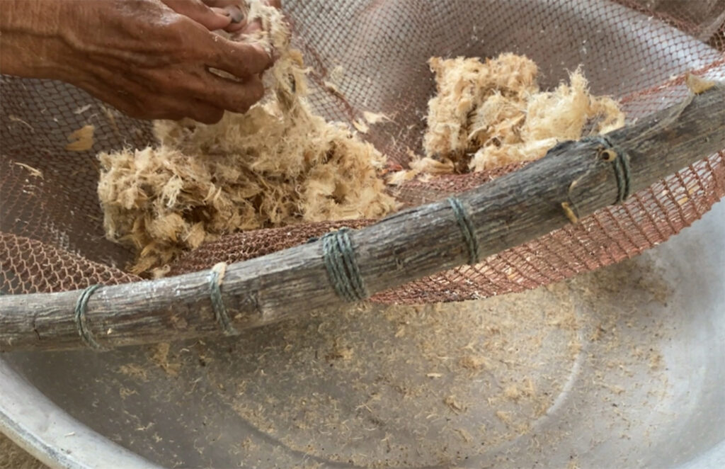 “จากการลองผิดลองถูกในครั้งแรกที่นำเปลือกทุเรียนมาตากแห้ง อบ และต้ม เพื่อปั่นเป็นเส้นใย แต่ผลลัพธ์ที่ได้คือ เส้นใยเสียสภาพและกระด้างมาก ในที่สุดทีมวิจัยได้เลือกใช้วิธีเดียวกับการทำกระดาษคือ การแช่ดองเปลือกทุเรียนด้วยน้ำเปล่าเป็นเวลานานประมาณ 20 วัน หรืออาจมากถึง 1 เดือน เพื่อให้เยื่อย่อยสลายจนสามารถสางออกได้ง่าย จากนั้นจึงนำเยื่อที่ได้ไปล้างทำความสะอาด ตากแห้ง และนำไปเข็นเป็นเส้นด้ายด้วยมือ ร่วมกับฝ้ายหรือไหมในระดับชุมชน ก่อนจะพัฒนาต่อยอดเข้าสู่กระบวนการผลิตเส้นด้ายในโรงงานอุตสาหกรรม เพื่อให้ได้มาตรฐานและความเร็ว ก่อนจะนำกลับมาทอด้วยมือในชุมชน 100 % โดยใช้เส้นด้ายไหมผสมเส้นใยทุเรียนเป็นเส้นพุ่ง เพื่อคงเสน่ห์ของงานฝีมือ (Craft) และสร้างมูลค่าเพิ่มให้กับผลิตภัณฑ์”