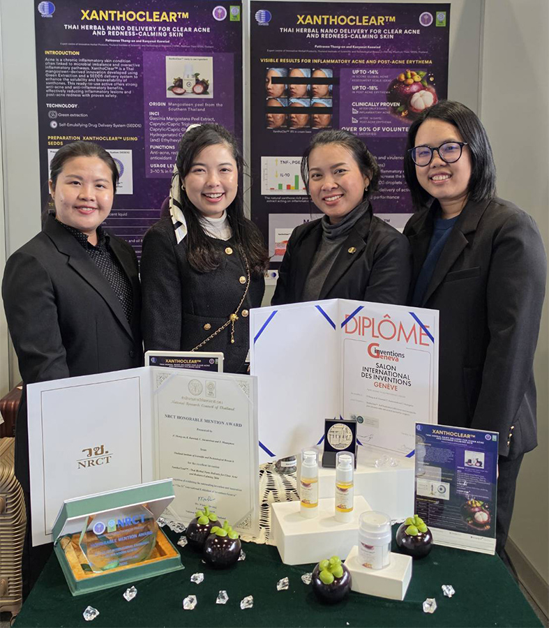 4.นวัตกรรมระบบนำส่งนาโนสารสกัดมังคุดไทย เพื่อดูแลปัญหาสิวและปลอบประลมผิวจากการอักเสบ (XanthoClear™: Thai Herbal Nano Delivery for Clear Acne and Redness-Calming Skin) ผลงานโดย ดร.ภัทราวีร์ ทองอ่อน นักวิจัย ดร.กัญญาณัฐ แก้วเอียด ดร.จิรเมธ อุฬารวิวัฒน์ นักวิจัย ศูนย์เชี่ยวชาญนวัตกรรมผลิตภัณฑ์สมุนไพร ดร.ธัญชนก เมืองมั่น ผอ.ศูนย์เชี่ยวชาญนวัตกรรมนวัตกรรมอาหารสุขภาพ **ได้รับรางวัล Silver medal จาก The 51st International Exhibition of Inventions Geneva และ NRCT Honorable Mention Award จาก วช.**