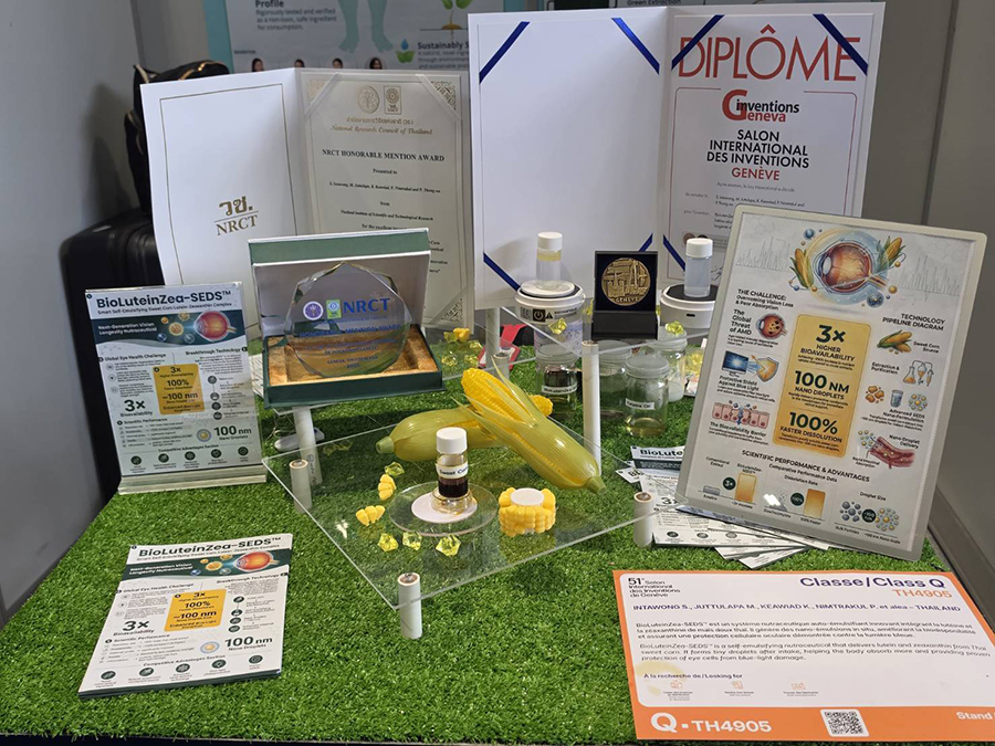 2. นวัตกรรมสารสกัดลูกทีน-ซีแซนทีนจากข้าวโพดหวานสายพันธุ์ไทย ที่พัฒนาในระบบกักเก็บและนำส่งอิมัลชันเกิดเองเพื่อสุขการมองเห็นระยะยาว (BioLuteinZea-SEDS™: Smart Self-Emulsifying Sweet Corn Lutein–Zeaxanthin Complex for Vision Longevity Nutraceutical) ผลงานโดย ดร.สมกมล อินทวงค์ นักวิจัยอาวุโส ดร.ภัทราวีร์ ทองอ่อน นักวิจัย ดร.ภัทรนภา นิ่มตระกูล นักวิจัย น.ส.มณีรัตน์ จัตตุลาภา นักวิจัย ศูนย์เชี่ยวชาญนวัตกรรมผลิตภัณฑ์สมุนไพร **ได้รับรางวัล Bronze medal จาก The 51st International Exhibition of Inventions Geneva และ NRCT Honorable Mention Award จาก วช.**