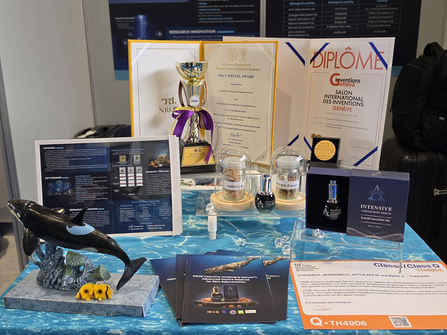 3. แอสมี อินเซนทีฟ แอเบอร์กริส ซีรั่ม : นวัตกรรมเอสเซนส์จากทะเลเชิงลึกเพื่อการฟื้นฟูและเสริมสร้างเซลล์ผิว (ASME Intensive Ambergris Serum™: Advanced Marine Essence for Skin Rejuvenation) ผลงานโดย ดร.กัญญาณัฐ แก้วเอียด นักวิจัย ดร.สมกมล อินทวงค์ นักวิจัยอาวุโส ดร.ภัทราวีร์ ทองอ่อน นักวิจัย และนางสาวมณีรัตน์ จัตตุลาภา นักวิจัย ศูนย์เชี่ยวชาญนวัตกรรมผลิตภัณฑ์สมุนไพร (ศนส.) **ได้รับรางวัล Gold medal จาก The 51st International Exhibition of Inventions Geneva และรางวัล NRCT Special Award จาก วช.**