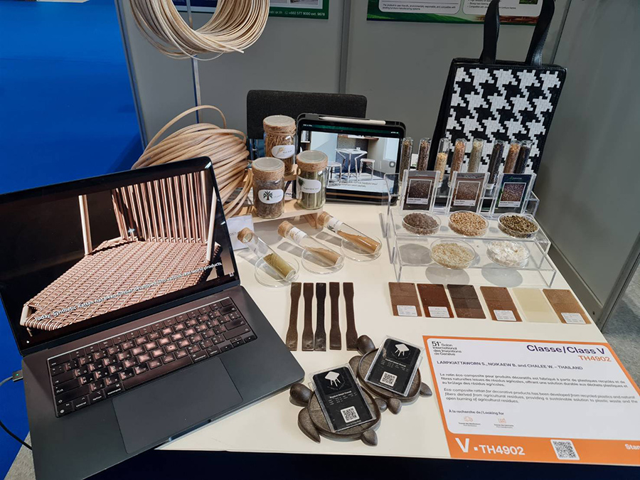 1. ผลิตภัณฑ์ตกแต่งจากหวายเทียมคอมโพสิตที่เป็นมิตรต่อสิ่งแวดล้อม (Eco-Composite Rattan for Decorative Products) ผลงานโดย ดร.ศิริพร ลาภเกียรติถาวร ผู้เชี่ยวชาญพิเศษ และดร.บุศรินทร์ น้อยแก้ว นักวิจัย ศูนย์ความเชี่ยวชาญนวัตกรรมวัสดุ **ได้รับรางวัล Gold medal จาก The 51st International Exhibition of Inventions Geneva, Special award จากTaiwan Invention Association และ NRCT Honorable Mention Award จาก วช.**