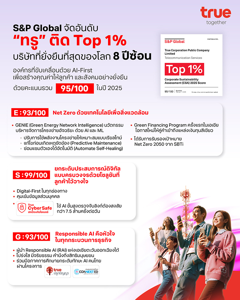 กรุงเทพฯ 16 มีนาคม 2569 – ในยุคที่ธุรกิจทั่วโลกกำลังเร่งยกระดับมาตรฐานความยั่งยืนและความรับผิดชอบต่อสังคม ทรู คอร์ปอเรชั่น ได้รับการจัดอันดับให้ติด Top 1% บริษัทที่มีความยั่งยืนที่สุดของโลกในรายงาน Sustainability Yearbook 2026 จาก S&P Global ต่อเนื่องเป็นปีที่ 8 ด้วยคะแนนรวม 95 จาก 100 คะแนน ในกลุ่มอุตสาหกรรมโทรคมนาคม จากการประเมินบริษัททั่วโลกตามเกณฑ์ Corporate Sustainability Assessment (CSA) ซึ่งครอบคลุมมิติ ทั้งด้านเศรษฐกิจ สังคม และสิ่งแวดล้อม ความสำเร็จดังกล่าวสะท้อนการเดินหน้าทรานส์ฟอร์มองค์กรของทรูสู่ AI-First Company ที่นำ AI มาใช้ในทุกกระบวนการธุรกิจอย่างรับผิดชอบ ก้าวข้ามบทบาทผู้ให้บริการเชื่อมต่อสู่การเป็นผู้นำบริษัทเทเลคอม-เทคโนโลยี ที่ส่งมอบประสบการณ์ดิจิทัลและยกระดับคุณภาพชีวิตของคนไทยผ่านระบบนิเวศดิจิทัลครบวงจรของทรู
