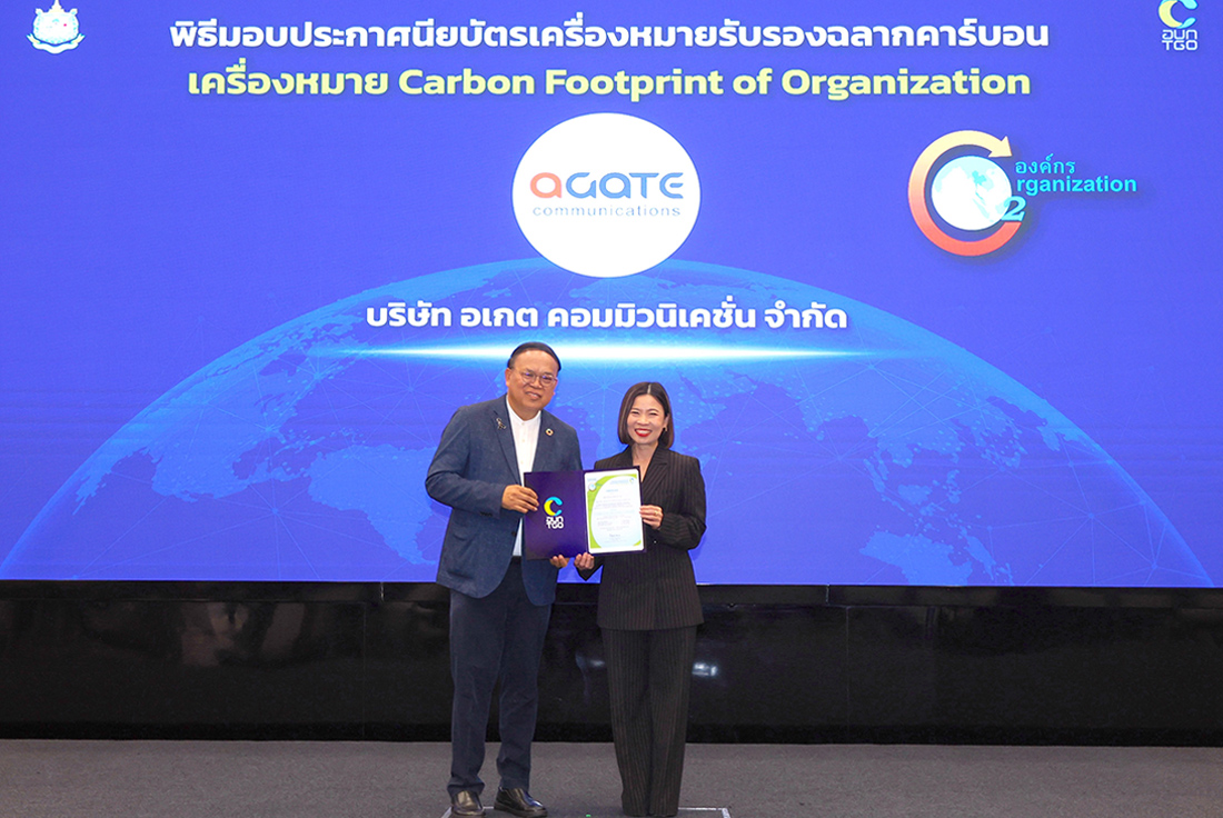 บริษัท อเกต คอมมิวนิเคชั่น จำกัด (Agate Communications) เดินหน้าสู่การเป็นองค์กรที่ขับเคลื่อนธุรกิจควบคู่ความยั่งยืนอย่างเป็นรูปธรรม โดย นางสาวอัญญาพร ธรรมติกานนท์ ประธานเจ้าหน้าที่บริหาร เข้ารับมอบประกาศนียบัตร เครื่องหมายคาร์บอนฟุตพริ้นท์ขององค์กร (Carbon Footprint for Organization: CFO) จาก ดร.วิจารย์ สิมาฉายา ประธานกรรมการองค์การบริหารจัดการก๊าซเรือนกระจก ณ สถาบันเพื่อการยุติธรรมแห่งประเทศไทย (TIJ) เมื่อเร็วๆ นี้ สะท้อนความมุ่งมั่นในการดำเนินธุรกิจที่ใส่ใจสิ่งแวดล้อมและรับผิดชอบต่อสังคมในระยะยาว