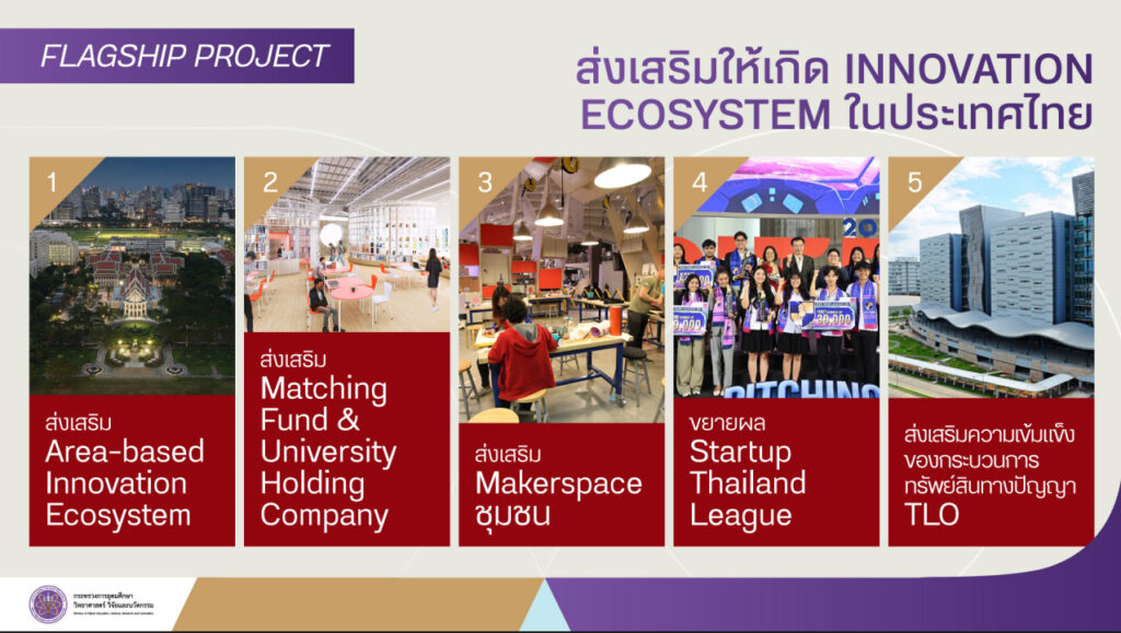 โดยเรื่องแรก ประกอบด้วยยุทธศาสตร์ที่ 1. คือ การส่งเสริมให้เกิดระบบนิเวศนวัตกรรม (Innovation Ecosystem) ในประเทศไทย เชื่อมโยงมหาวิทยาลัย ภาครัฐ เอกชน แหล่งทุน และผู้ประกอบการ พร้อมผลักดันการยกระดับงานวิจัยสู่เทคโนโลยีเชิงลึกและการใช้ประโยชน์ทรัพย์สินทางปัญญาในเชิงพาณิชย์ โดยจะมีโครงการ Flagship ที่จะส่งเสริมให้เกิด Innovation Ecosystem ในประเทศไทย เช่น การส่งเสริม Area-based Innovation Ecosystem ส่งเสริม Matching Fund & university Holding Company ส่งเสริมMakerspace ชุมชน ขยายผล Startup Thailand League และส่งเสริมความเข้มแข็งของกระบวนการทรัพย์สินทางปัญญา(TLO)
