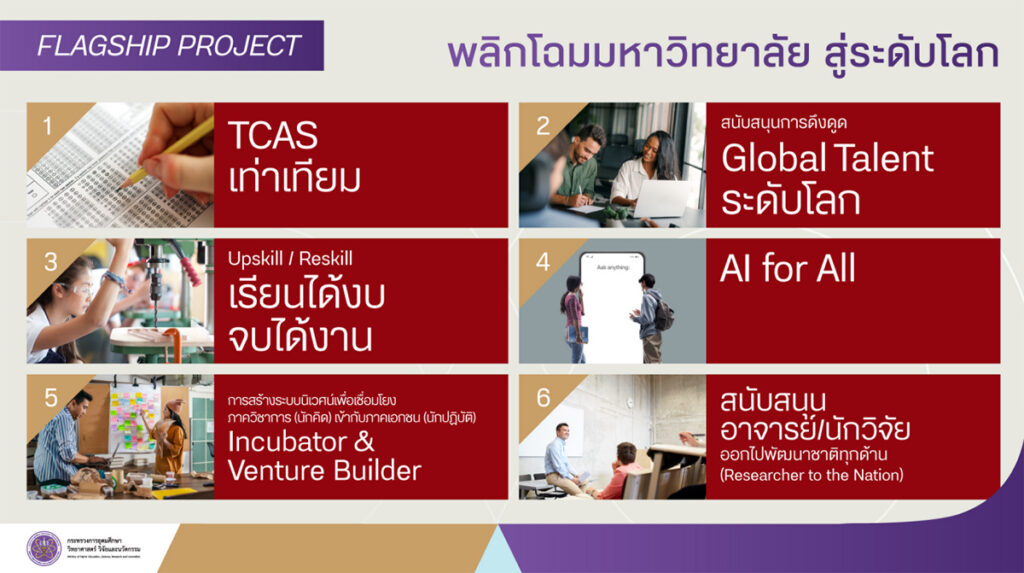 ขณะที่เรื่องสุดท้ายซึ่งเกี่ยวกับการศึกษา คือ ยุทธศาสตร์ที่ 8 การพลิกโฉมมหาวิทยาลัยสู่ระดับโลก (World-Class University) เพื่อเป็นแหล่งสร้างองค์ความรู้และพัฒนากำลังคนคุณภาพสูง โดยจะทำทั้งเรื่อง TCAS เท่าเทียม, Upskill Reskill เรียนได้งบจบได้งาน, การสร้างระบบนิเวศเพื่อเชื่อมโยงภาควิชาการ(นักคิด) เข้ากับภาคเอกชน (นักปฏิบัติ,) สนับสนุนการดึงดูด Global Talent ระดับโลก, และการสนับสนุนอาจารย์/ นักวิจัย ออกไปพัฒนาชาติในด้านต่าง ๆ