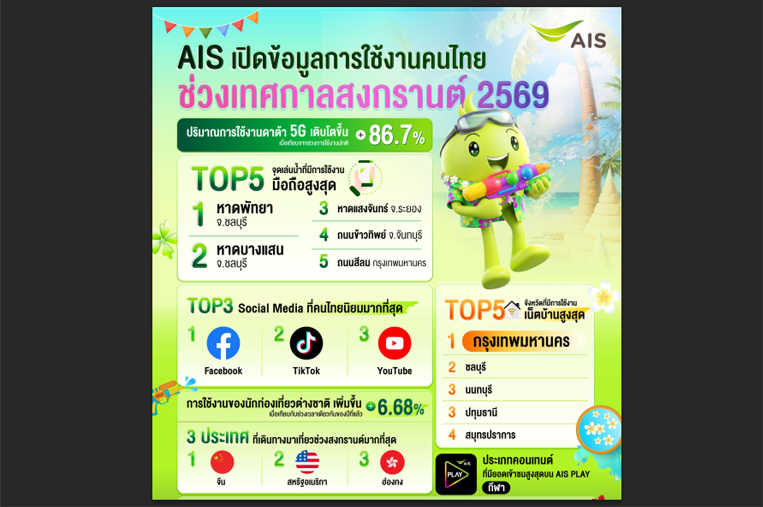16 เมษายน 69 AIS เปิดอินไซต์พฤติกรรมการใช้งานดิจิทัลของลูกค้าและคนไทยในช่วงเทศกาลสงกรานต์ ปี 2569 โดยนำเทคโนโลยี AI และ Autonomous Network มายกระดับโครงข่ายทั้งมือถือและเน็ตบ้าน เพื่อรองรับการใช้งานที่เพิ่มขึ้นตลอดช่วงเทศกาล โดยปีนี้พบว่า “หาดพัทยา จ.ชลบุรี” เป็นจุดเล่นน้ำที่มีการใช้งานดาต้าสูงสุด สะท้อนความนิยมของแหล่งท่องเที่ยวสำคัญของประเทศ ขณะเดียวกันแพลตฟอร์มโซเชียลมีเดียอย่าง Facebook และ TikTok ครองอันดับแอปพลิเคชันยอดนิยม สอดคล้องกับการเติบโตของการรับชมคอนเทนต์รูปแบบวิดีโอสั้น (Short Video) และสตรีมมิ่งที่ขยายตัวต่อเนื่อง สะท้อนพฤติกรรมการรับชมคอนเทนต์ได้ทุกเวลา โดยเฉพาะคอนเทนต์ประเภท “กีฬา” ที่ได้รับความนิยมสูงสุดบน AIS PLAY