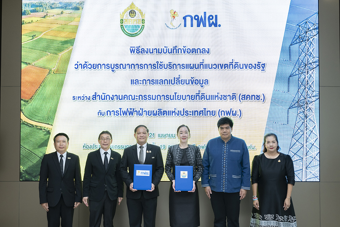 กฟผ. และ สคทช. ลงนามบันทึกข้อตกลงความร่วมมือ (MOU) เพื่อบูรณาการข้อมูลแผนที่แนวเขตที่ดินของรัฐ (One Map) กับฐานข้อมูลดิจิทัลระบบโครงข่ายไฟฟ้า มุ่งเพิ่มประสิทธิภาพการบริหารจัดการที่ดินของรัฐ สนับสนุนการพัฒนาโครงสร้างพื้นฐานด้านพลังงาน พร้อมส่งเสริมคุณภาพชีวิตชุมชนในพื้นที่ จัดสรรที่ดินทำกินอย่างยั่งยืน