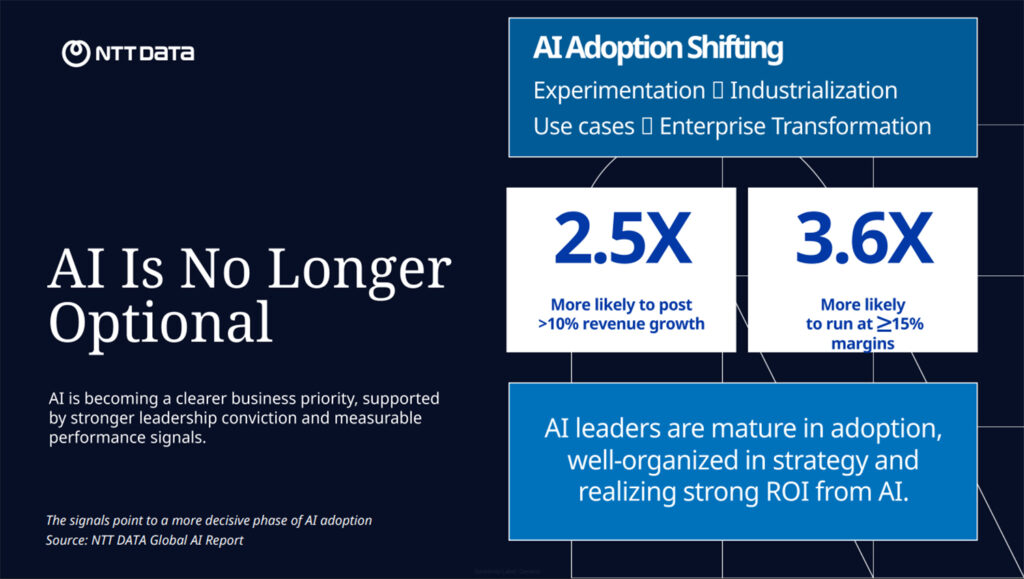 ทั้งนี้ NTT DATA, Inc. ได้นำความเชี่ยวชาญระดับโลก ผสานความเข้าใจตลาดท้องถิ่น และวัฒนธรรมองค์กรแบบ people-first เพื่อสนับสนุนองค์กรไทยก้าวจากการเริ่มต้นใช้งาน AI ไปสู่การทรานส์ฟอร์มในระดับองค์กรอย่างเต็มรูปแบบ ในฐานะ “Trusted End-to-End Digital Transformation Partner” บริษัทฯ ช่วยให้องค์กรสามารถนำ AI ไปใช้งานได้อย่างเป็นระบบ ปลอดภัย และสร้างผลลัพธ์ทางธุรกิจได้อย่างเป็นรูปธรรมและขับเคลื่อนการเติบโตอย่างยั่งยืน
