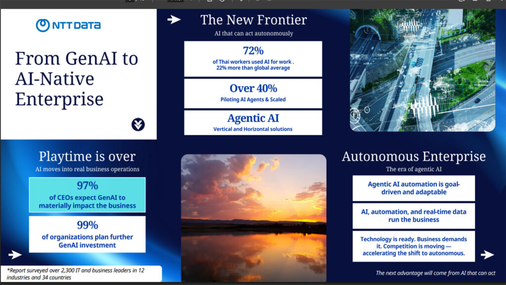 นายธนพงษ์ อิทธิสกุลชัย กรรมการผู้จัดการ NTT DATA, Inc. กล่าวว่า ท่ามกลางแรงกดดันทางเศรษฐกิจและการแข่งขันที่ทวีความเข้มข้น องค์กรไทยกำลังเร่งปรับตัวสู่การทรานส์ฟอร์มอย่างจริงจัง โดยให้ความสำคัญกับประสิทธิภาพ ความยืดหยุ่น และการลงทุนอย่างมีวินัยมากยิ่งขึ้น เทคโนโลยีปัญญาประดิษฐ์ หรือ AI จึงไม่ได้เป็นเพียงทางเลือกอีกต่อไป แต่ได้กลายเป็นปัจจัยสำคัญในการขับเคลื่อนศักยภาพทางธุรกิจและการเติบโตในระยะยาว