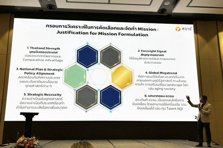ดร.สุรชัย ยังได้ฉายภาพให้เห็นการเปลี่ยนผ่านจากกรอบยุทธศาสตร์กว้างสู่ภารกิจที่เป็นรูปธรรม ในการจัดทำกรอบ นโยบาย อววน. พ.ศ. 2571-2575 เน้นการนำ อววน. ไป แก้ปัญหาโจทย์ประเทศ/สร้างโอกาสใหม่ มีกรอบกว้างแต่มีเป้าหมายชัด และเลือกปัญหาโดยไม่ล็อกแนวทางการแก้ปัญหา ใช้แนวทาง Mission Portfolio ในการบริหารเป็นชุดโครงการ เพื่อปรับ/ลด บริหารทรัพยากรได้และสำรวจหลายทางเลือกไปสู่เป้าหมาย ซึ่งเป้าหมายจะเน้น Mission outcomes มีกรอบเวลาแน่นอนและทำงานบูรณาการโดยมีเป้าหมายร่วมที่ชัดเจน