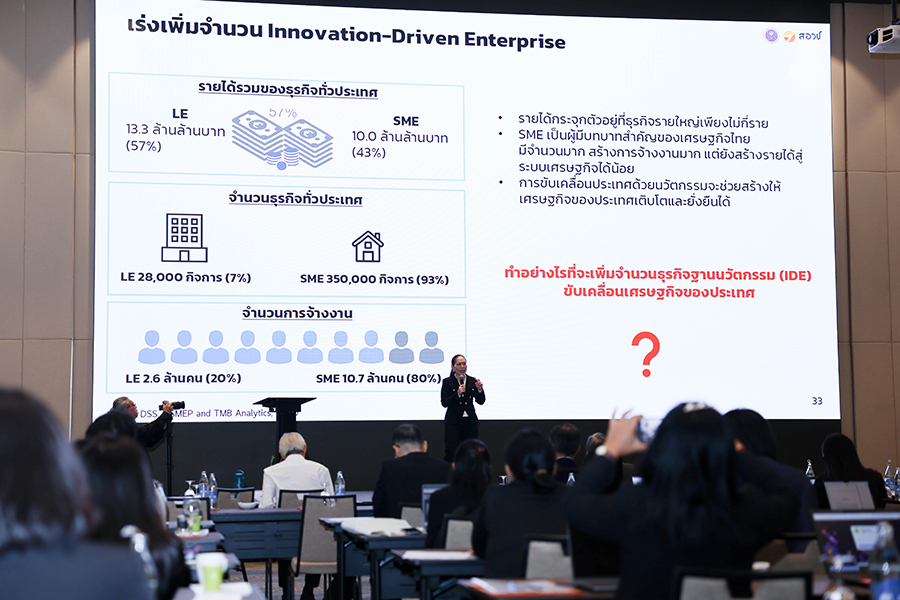 นอกจากนี้ ยังได้ยกตัวอย่างการดำเนินงานเพื่อขับเคลื่อนการสร้างผู้ประกอบการนวัตกรรม (Innovation-driven Enterprise) ทั้งการปลดล็อกกฎหมายเพื่อส่งเสริมธุรกิจนวัตกรรม การส่งเสริมระบบนิเวศผู้ประกอบการนวัตกรรม การจัดทำข้อเสนอแนะเชิงนโยบายเพื่อพัฒนามาตรการและกลไกส่งเสริมธุรกิจฐานนวัตกรรม การพัฒนาแพลตฟอร์มการขยายตลาดของผู้ประกอบการนวัตกรรม (E-Commercial and Innovation Platform: ECIP) นโยบายส่งเสริมการร่วมลงทุนในธุรกิจนวัตกรรมด้วยกลไก University Holding Company (UHC) รวมถึงนโยบาย Offset ที่มีเป้าหมายเพื่อนำพาอุตสาหกรรมไทยให้เป็นผู้เล่นสำคัญในห่วงโซ่อุปทานโลก