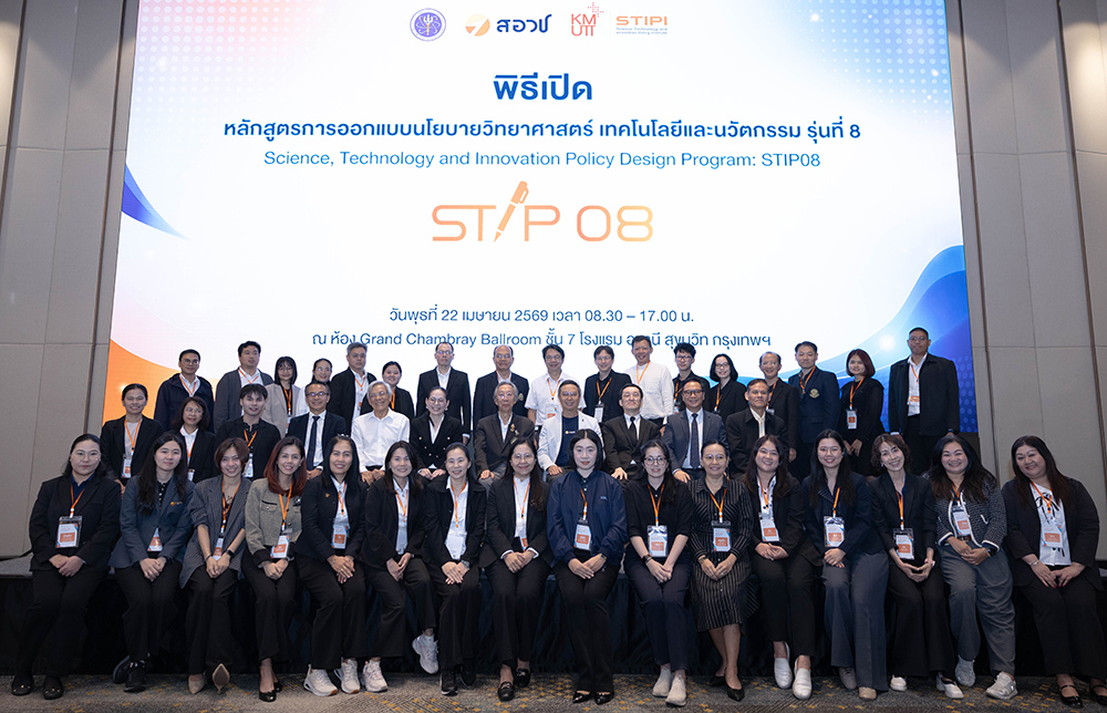 กระทรวงการอุดมศึกษา วิทยาศาสตร์ วิจัยและนวัตกรรม (อว.) โดย สำนักงานสภานโยบายการอุดมศึกษา วิทยาศาสตร์ วิจัยและนวัตกรรมแห่งชาติ (สอวช.) ร่วมกับ สถาบันนโยบายวิทยาศาสตร์ เทคโนโลยีและนวัตกรรม (STIPI) มหาวิทยาลัยเทคโนโลยีพระจอมเกล้าธนบุรี (มจธ.) จัดพิธีเปิดหลักสูตรการออกแบบนโยบายวิทยาศาสตร์ เทคโนโลยีและนวัตกรรม รุ่นที่ 8 (STI Policy Design: STIP08) เมื่อวันที่ 22 เมษายน 2569 ณ ห้อง Grand Chambray Ballroom ชั้น 7 โรงแรม อวานี สุขุมวิท กรุงเทพฯ โดยมี ดร.สุรชัย สถิตคุณารัตน์ ผู้อำนวยการ สอวช. และ รศ. ดร.สุวิทย์ แซ่เตีย อธิการบดี มจธ. เป็นผู้กล่าวเปิดการอบรม