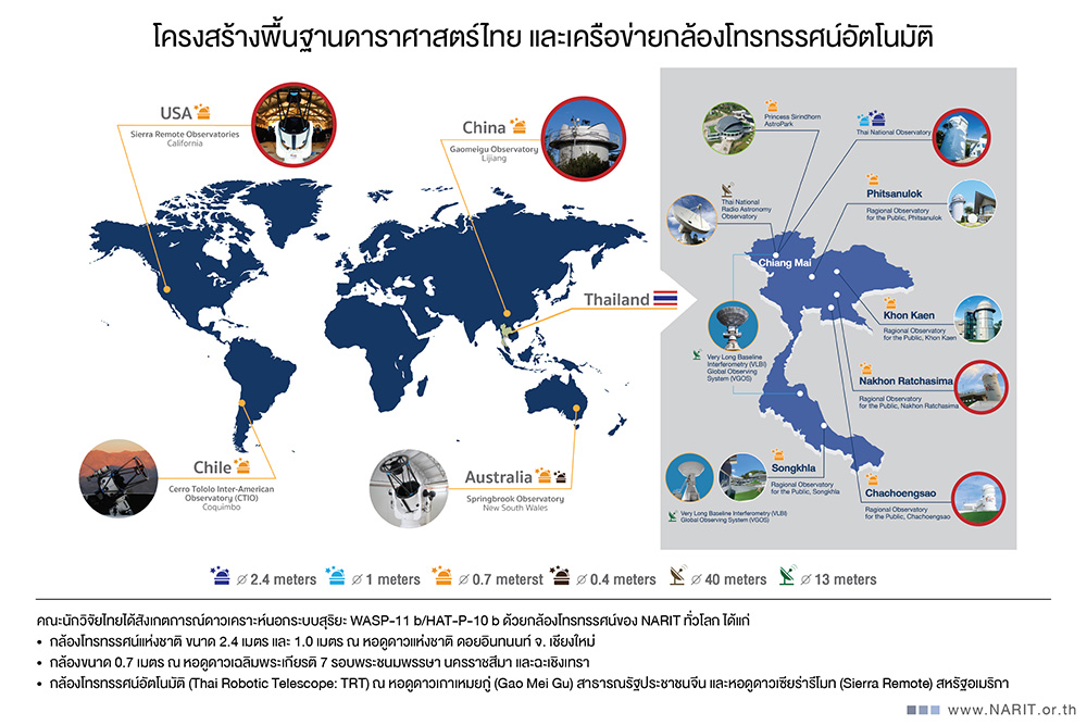ทีมนักวิจัยสถาบันวิจัยดาราศาสตร์แห่งชาติ (สดร. หรือ NARIT) กระทรวงการอุดมศึกษา วิทยาศาสตร์ วิจัย และนวัตกรรม (อว.) นำโดย ดร. นภาพร อะทะโน และ ดร. ศุภชัย อาวิพันธุ์ ร่วมกับเครือข่ายนักดาราศาสตร์นานาชาติ เปิดเผยความสำเร็จในการศึกษาวิจัยดาวเคราะห์นอกระบบสุริยะ WASP-11 b/HAT-P-10 b โดยใช้ข้อมูลการผ่านหน้าของดาวเคราะห์ (Transit) จำนวน 31 เหตุการณ์ ซึ่งเก็บรวบรวมมาอย่างยาวนานเกือบ 10 ปี จากเครือข่ายกล้องโทรทรรศน์ของ สดร. หนึ่งในข้อมูลสำคัญมาจากการสังเกตการณ์ฝีพระหัตถ์ สมเด็จพระกนิษฐาธิราชเจ้า กรมสมเด็จพระเทพฯ เมื่อครั้งเสด็จเยือนหอดูดาวแห่งชาติ ปลายปี 2559 จากการนำข้อมูลทั้งหมดมาวิเคราะห์ร่วมกับข้อมูลจากดาวเทียม TESS เพื่อศึกษาพฤติกรรมวงโคจรและลักษณะทางกายภาพของชั้นบรรยากาศดาวเคราะห์นอกระบบดังกล่าวอย่างละเอียด ได้ช่วยให้เข้าใจลักษณะของดาวเคราะห์นอกระบบประเภทดาวพฤหัสบดีร้อนมากยิ่งขึ้น งานวิจัยนี้ได้รับการตีพิมพ์ในวารสารวิชาการระดับนานาชาติ The Astronomical Journal เมื่อต้นเดือนเมษายน 2569 ที่ผ่านมา