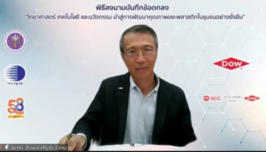 นายฉัตรชัย เลื่อนผลเจริญชัย ประธานบริหาร กลุ่มบริษัท ดาว ประเทศไทย กล่าวว่า จากสถานการณ์ปัจจุบันพบว่าปริมาณขยะในประเทศไทยมีแนวโน้มเพิ่มขึ้นอย่างต่อเนื่อง โดยเฉพาะในช่วงการแพร่ระบาดโควิด-19 ซึ่งปริมาณขยะพลาสติกเพิ่มขึ้นถึง 15% โดยปริมาณขยะพลาสติกเฉลี่ยจากวันละ 5,500 ตัน เพิ่มเป็น 6,300 ตันต่อวัน แต่สามารถนำเข้าสู่ระบบรีไซเคิลได้เพียง 23% เท่านั้น เพื่อเป็นการป้องกันขยะพลาสติกหลุดรอดออกสู่สิ่งแวดล้อม และลดปัญหาการสะสมขยะในชุมชน รัฐบาลจึงได้มีเป้าหมายในการนำขยะพลาสติกกลับมารีไซเคิล 100% ภายในปี 2570 เพื่อให้เกิดการขับเคลื่อนระบบรีไซเคิลได้อย่างมีประสิทธิภาพ เพื่อร่วมกันแก้ปัญหาขยะอย่างยั่งยืน Dow และ วว. จึงได้นำความเชี่ยวชาญของทั้งสององค์กรมาบูรณาการร่วมกัน โดยจะนำความเชี่ยวชาญด้านวัสดุศาสตร์และประสบการณ์ในการส่งเสริมการมีส่วนร่วมของชุมชนของ Dow มาผสานกับองค์ความรู้ด้านทางด้านวิทยาศาสตร์ เทคโนโลยี และนวัตกรรมของ วว. โดยเริ่มจากการต่อยอดในชุมชนต้นแบบที่ทั้งสององค์กรได้เคยดำเนินการไปก่อนหน้านี้ ก่อนจะขยายผลไปสู่ชุมชนอื่น ๆ ในอนาคต