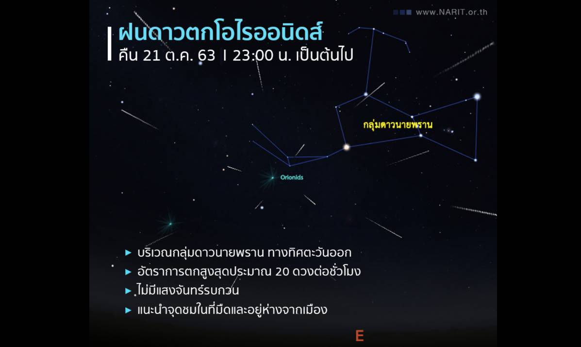 นายศุภฤกษ์ คฤหานนท์ หัวหน้างานบริการวิชาการทางดาราศาสตร์ สถาบันวิจัยดาราศาสตร์แห่งชาติ (องค์การมหาชน) หรือ สดร. กระทรวงการอุดมศึกษา วิทยาศาสตร์ วิจัยและนวัตกรรม (อว.) เปิดเผยว่า “ฝนดาวตกโอไรออนิดส์ หรือฝนดาวตกกลุ่มดาวนายพราน” จะเกิดขึ้นในช่วงวันที่ 2 ตุลาคม – 7 พฤศจิกายน ของทุกปี ในปีนี้คาดว่ามีอัตราการตกสูงสุดในคืน 21 – 22 ตุลาคม 2563 สามารถสังเกตเห็นตั้งแต่เวลาประมาณ 23.00 น. ของวันที่ 21 ตุลาคม จนถึงรุ่งเช้าของวันที่ 22 ตุลาคม 2563 มีศูนย์กลางการกระจายอยู่ทางทิศตะวันออก บริเวณแขนของกลุ่มดาวนายพราน คาดการณ์ว่าจะมีอัตราการตกสูงสุดเฉลี่ยประมาณ 20 ดวงต่อชั่วโมง หากฟ้าใสไร้ฝนสามารถชมความสวยงามของดาวตกโอไรออนิดส์ได้ทั่วประเทศ